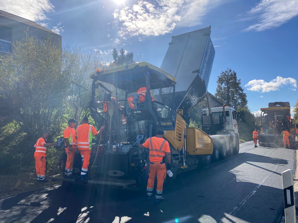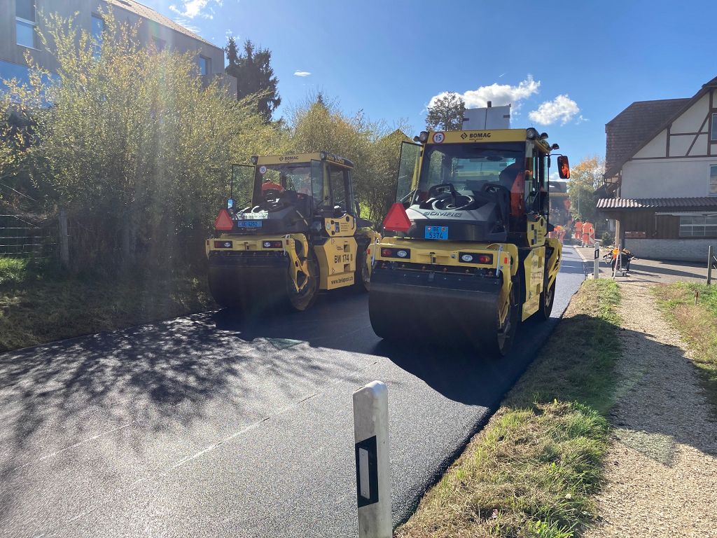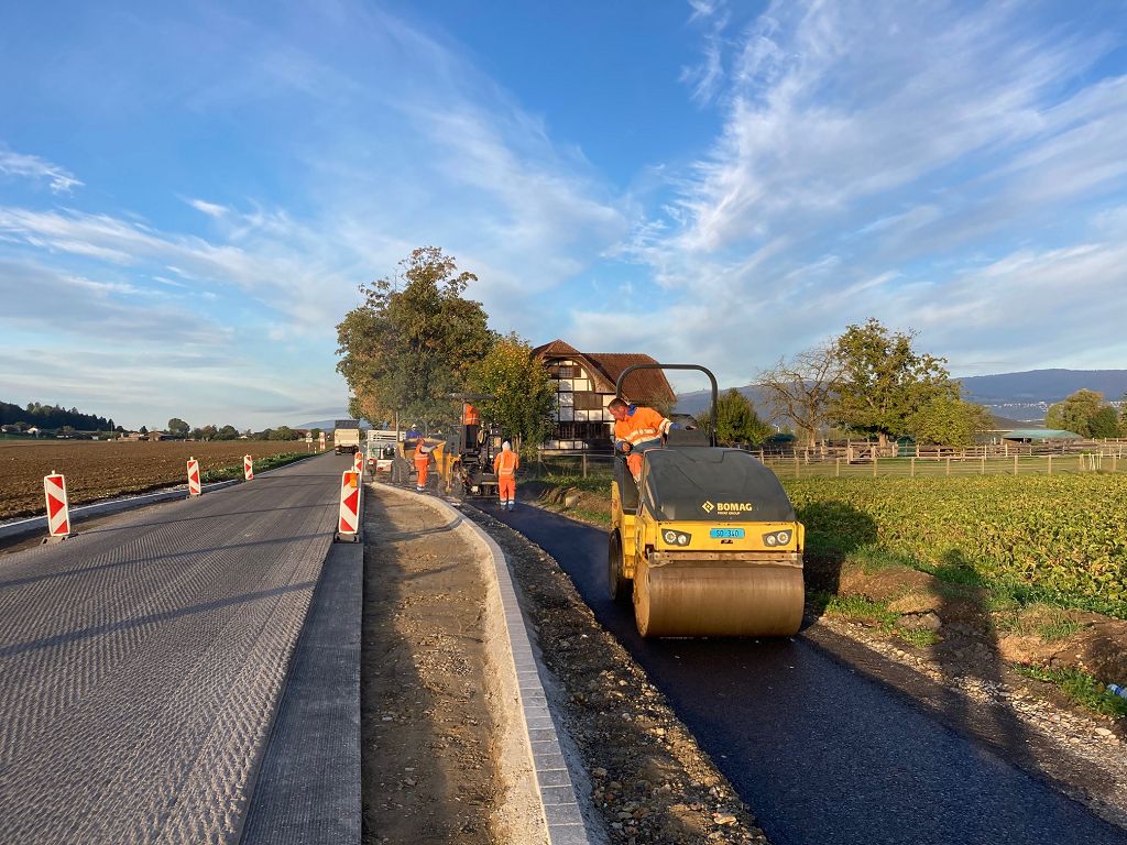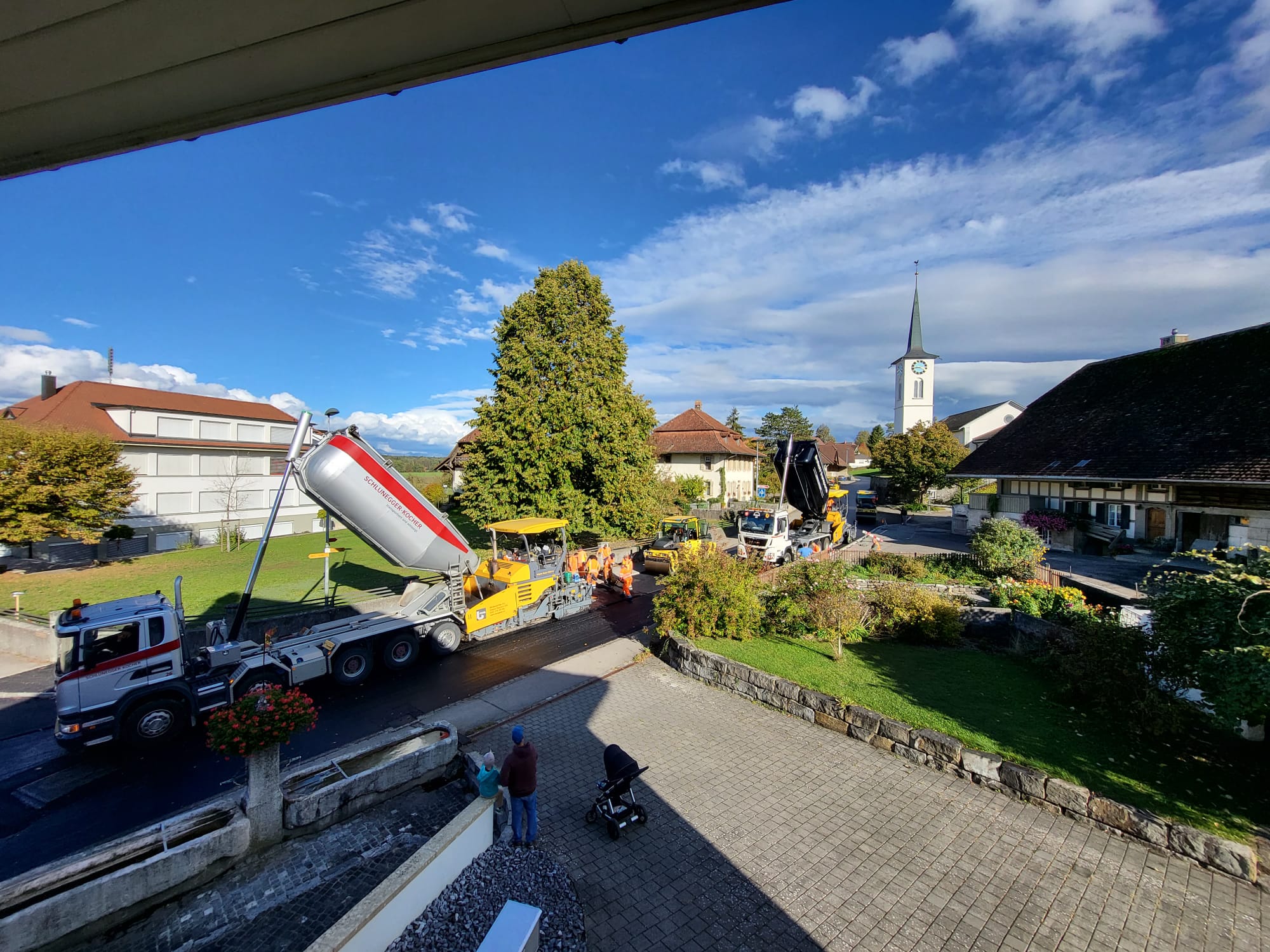 Fin octobre, nous avons pu réaliser pour la société Gebr. Jetzer AG à Diessbach chez Büren avec 4 machines de pose différentes et 2 rouleaux pour remettre en état la route du village.